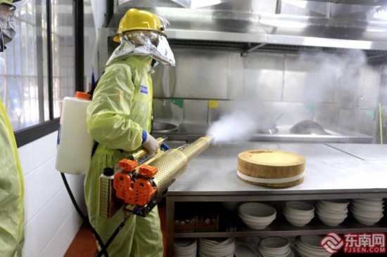 在仓山区科技园食堂内开展消毒。东南网记者 林先昌 摄