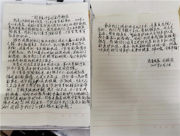4月3日,是小宝回院复查的日子。看到CT复查显示结石完全清除后,父母的感激之情溢于言表,一年多的心头之患终于得到释怀。这一天,这位年轻的妈妈,亲笔写下了感谢信,以表达自己的感激之情。